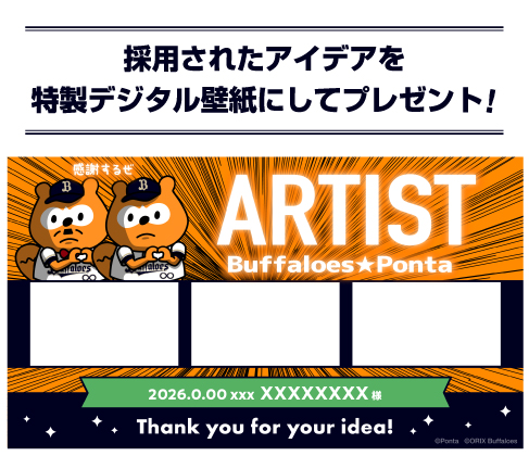 期間中、厳正なる審査を行ない、見事アイデアが採用された方にはバファローズポンタ公式X (旧:Twitter)「@bs_ponta」から個別にダイレクトメッセージをお送りいたします。当選発表および景品のお渡しは、採用されたアイデアが、バファローズポンタ公式X(旧:Twitter)「@bs_ponta」にて投稿された翌月末頃までにDMの発送をもって完了とさせて頂きます。諸事情により遅れる場合もございますので、予めご了承ください。
