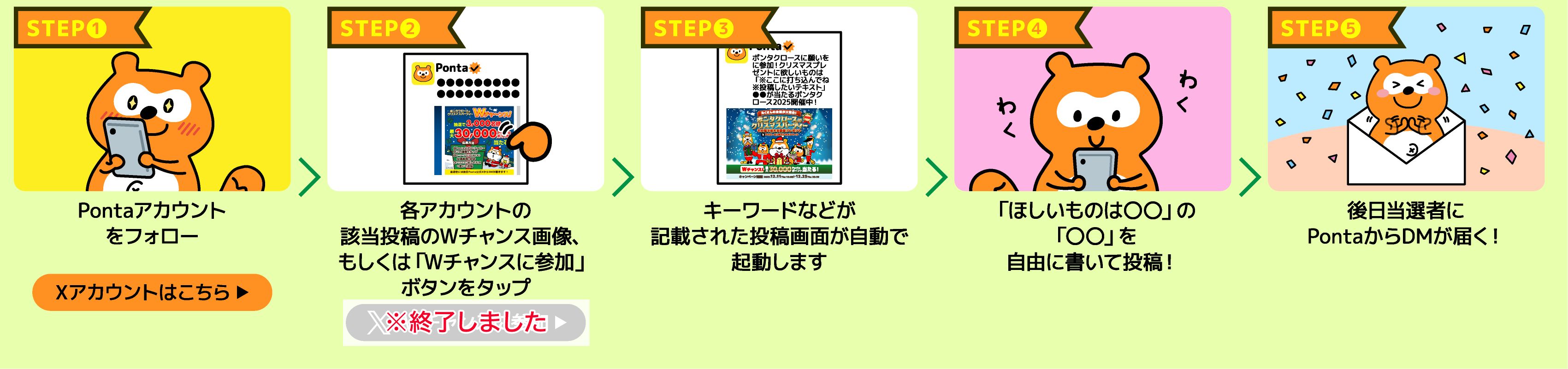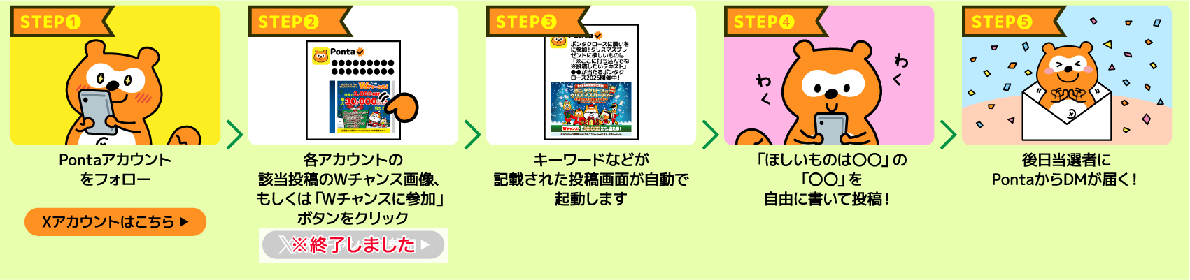 厳正なる抽選のうえ、当選者には各キャンペーン実施後4週間以内を目処に、ご応募いただいたXアカウント宛てにPonta公式Xアカウント「@Ponta」よりダイレクトメッセージ(以降DMと表記)でご連絡いたします。